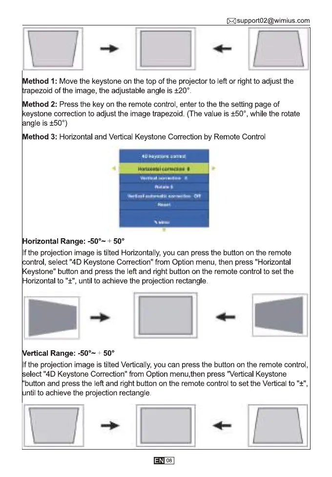 eystone correction to adjust the image trapezoid. (The value is ±500,while the rotate