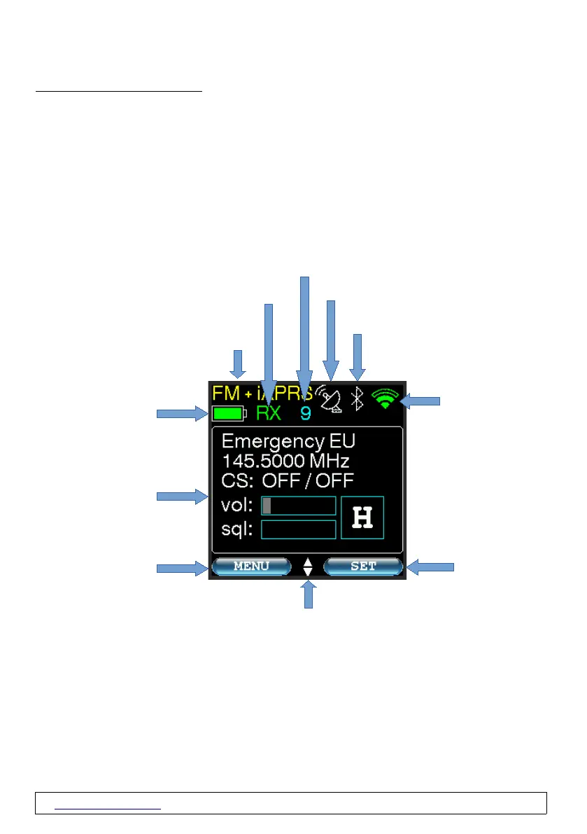 The screen has no touch function. The "soft buttons" shown (in light blue, here "MENU" and SET")