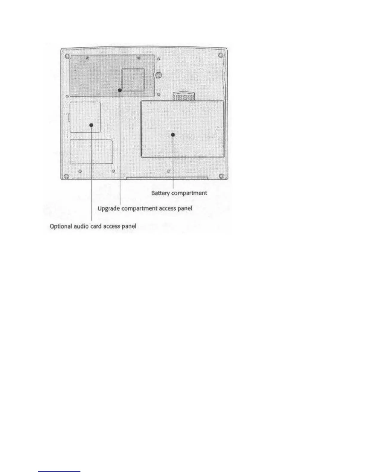 The battery, audio card, and memory compartments are on the underside of the computer.
