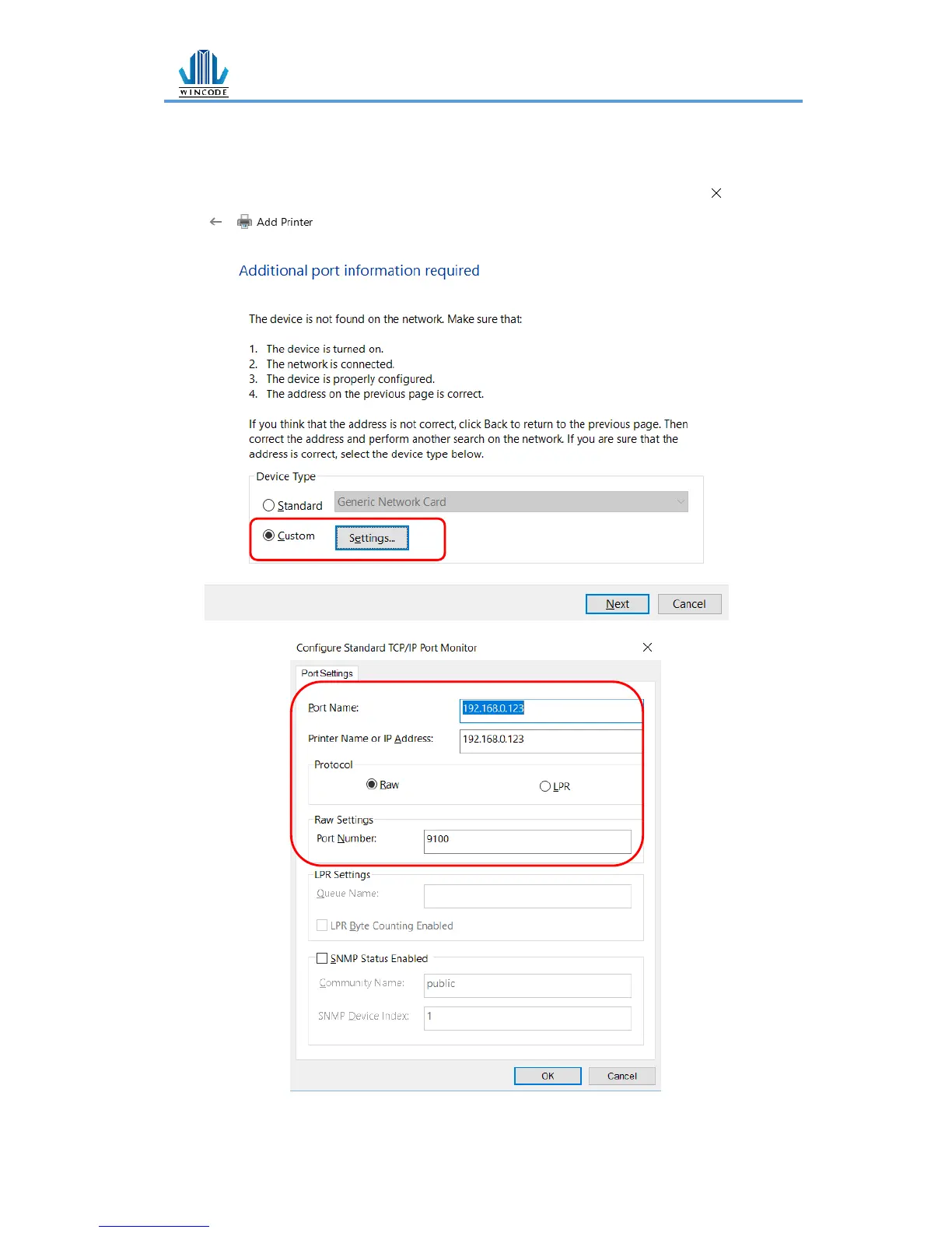 5) Select “Custom, enter “Settings, key-in the port name, printer name or IP