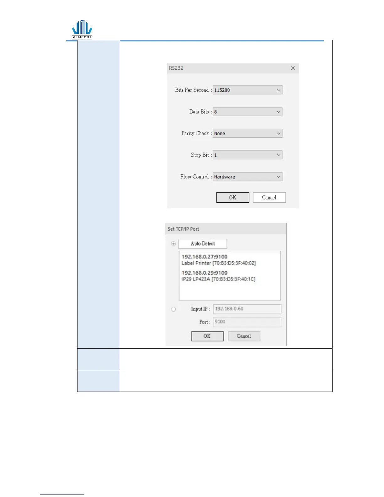 RS-232: bps, data bit, parity check, stop bit, flow control selection.