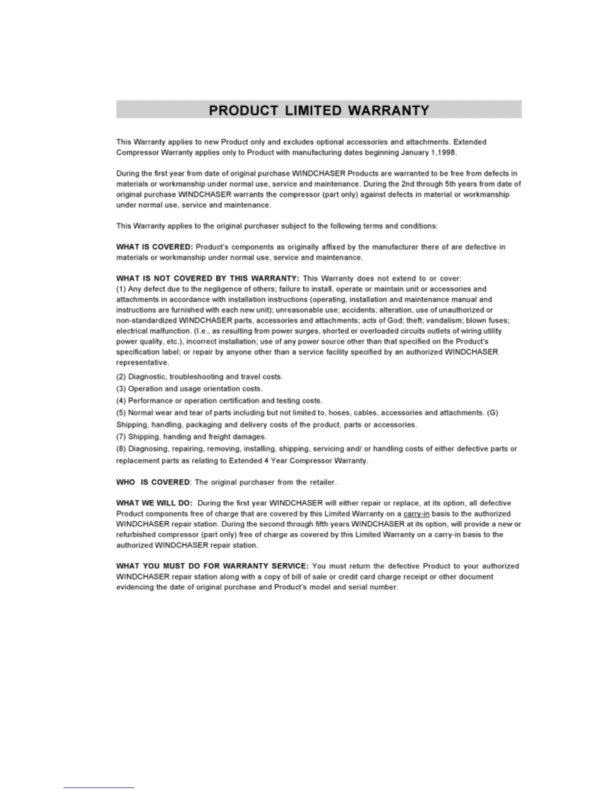 Windchaser PAC9 - PRODUCT LIMITED WARRANTY