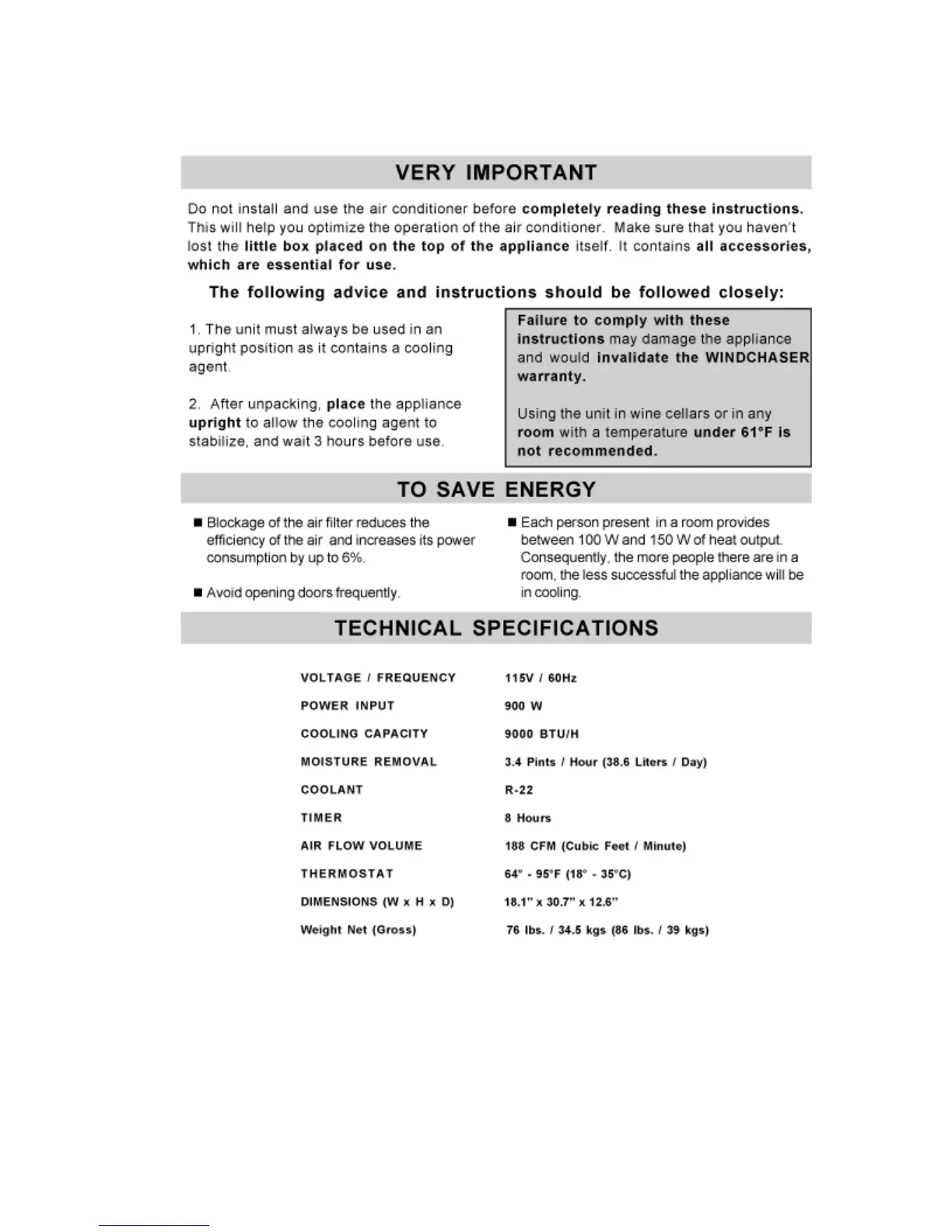 Windchaser PAC9 - VERY IMPORTANT; TO SAVE ENERGY; TECHNICAL SPECIFICATIONS