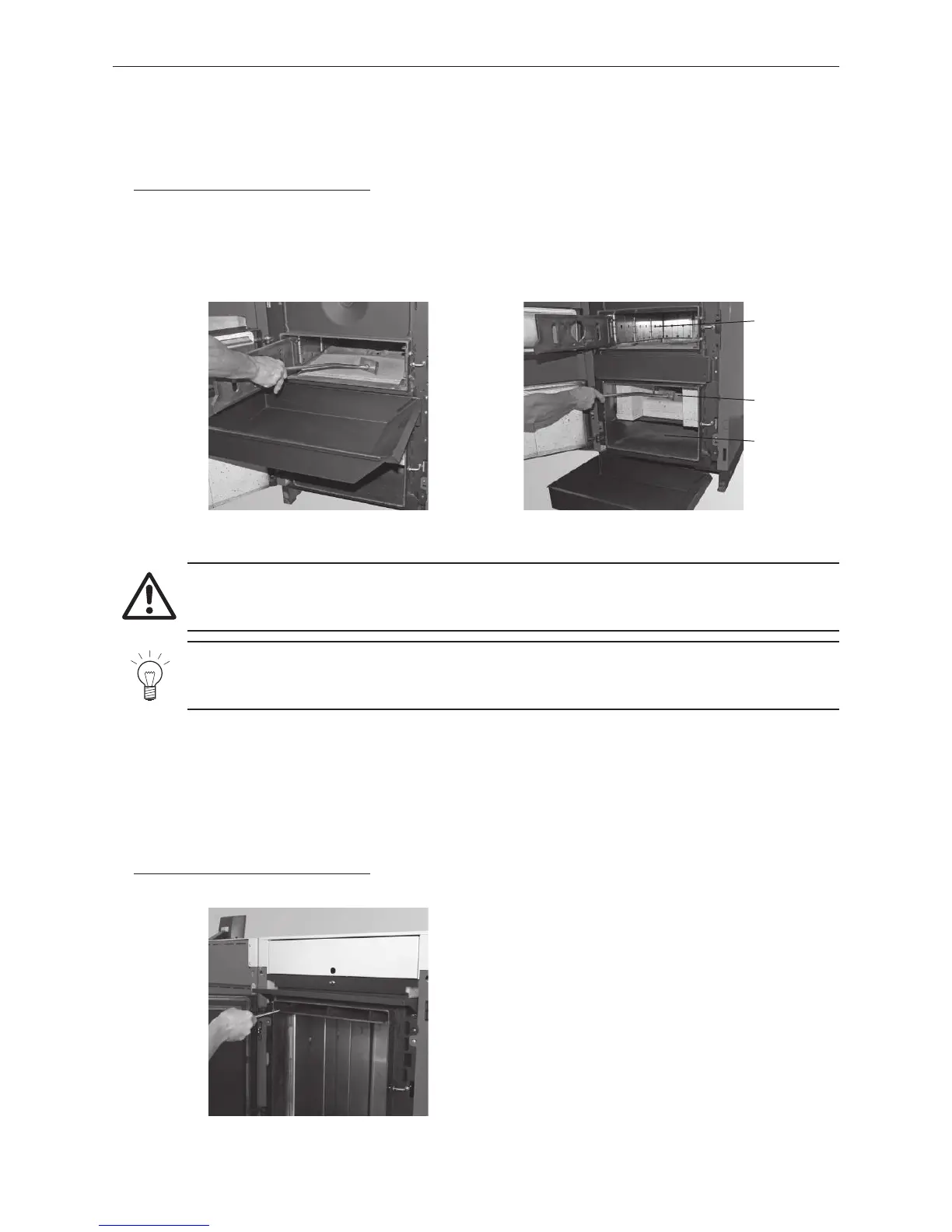 – Place ash pan under ash door (bottom door). Open ash door and carefully take all of the accumulated ash out