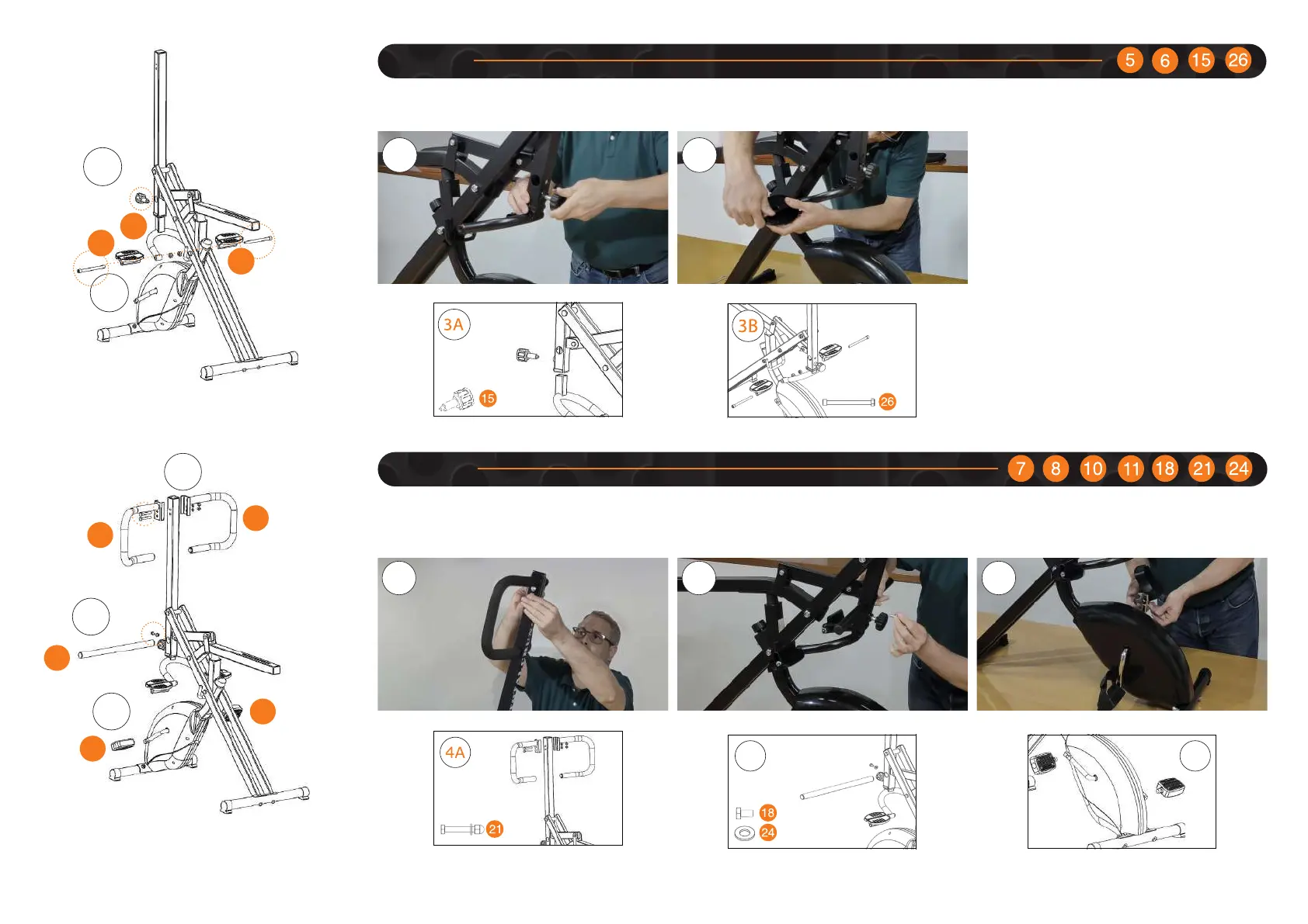 - Befestigen Sie das obere Fußrohr (8) mit der Schraube 18 (1 St.) und der Unterlegscheibe 24 (1 St.) am vertikalen Rohr (4B).