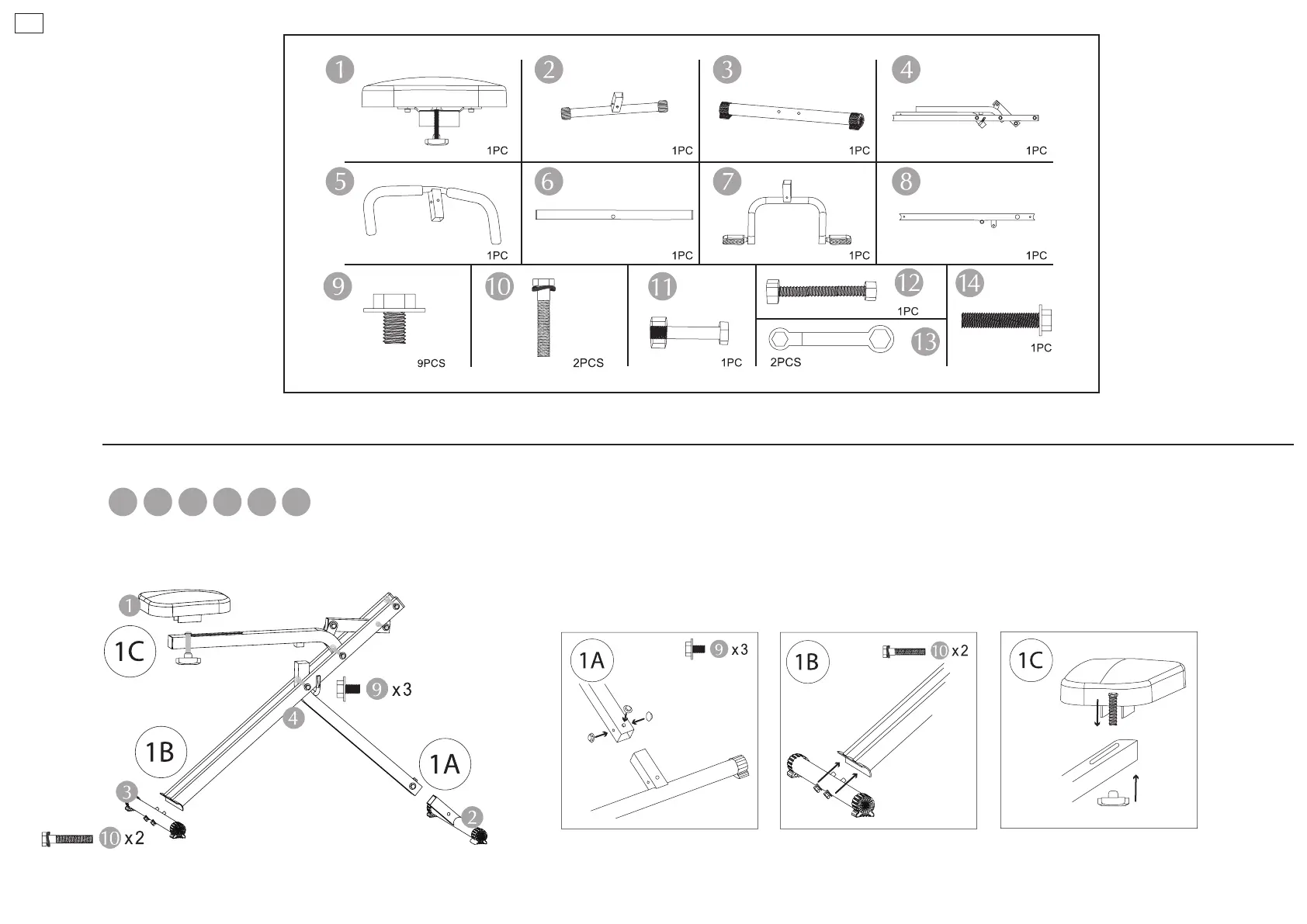 Bevestig het hoofdgedeelte van het toestel op de voetsteunen (1A/1B). Bevestig het zadel. U kunt de stand van het zadel aanpassen zoals u wilt (1C).