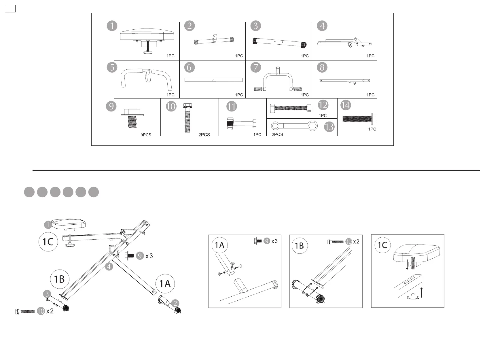 Monte el soporte principal y el soporte trasero (1A/1B). Fije el sillín. Puede ajustar su posición a conveniencia (1C).