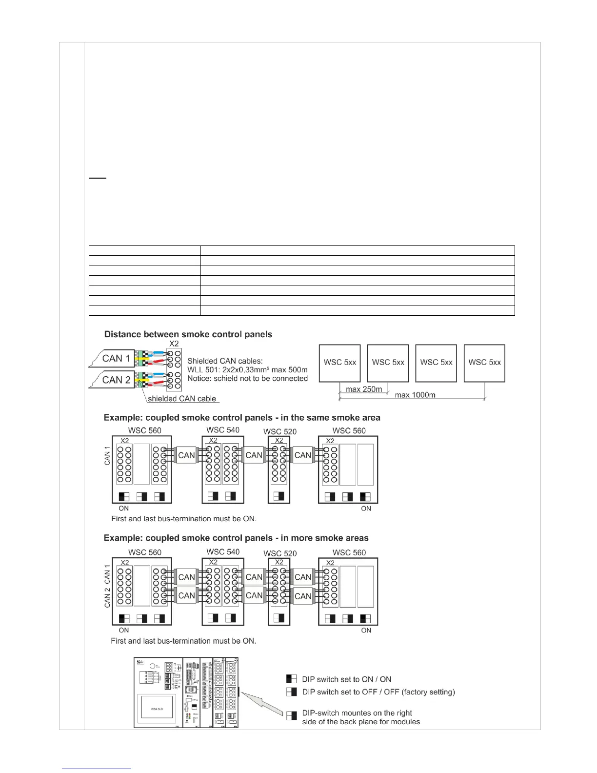 Section 9 "Cable plan for connection to WSC 5xx" and drawing below. The CAN cable between two smoke ventilation