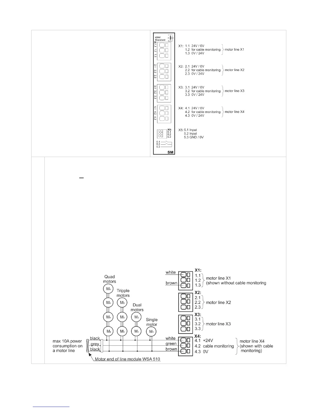The WSA 5SM module has four motor lines (X1, X2, X3 and X4) for connection of ±24V standard motors.