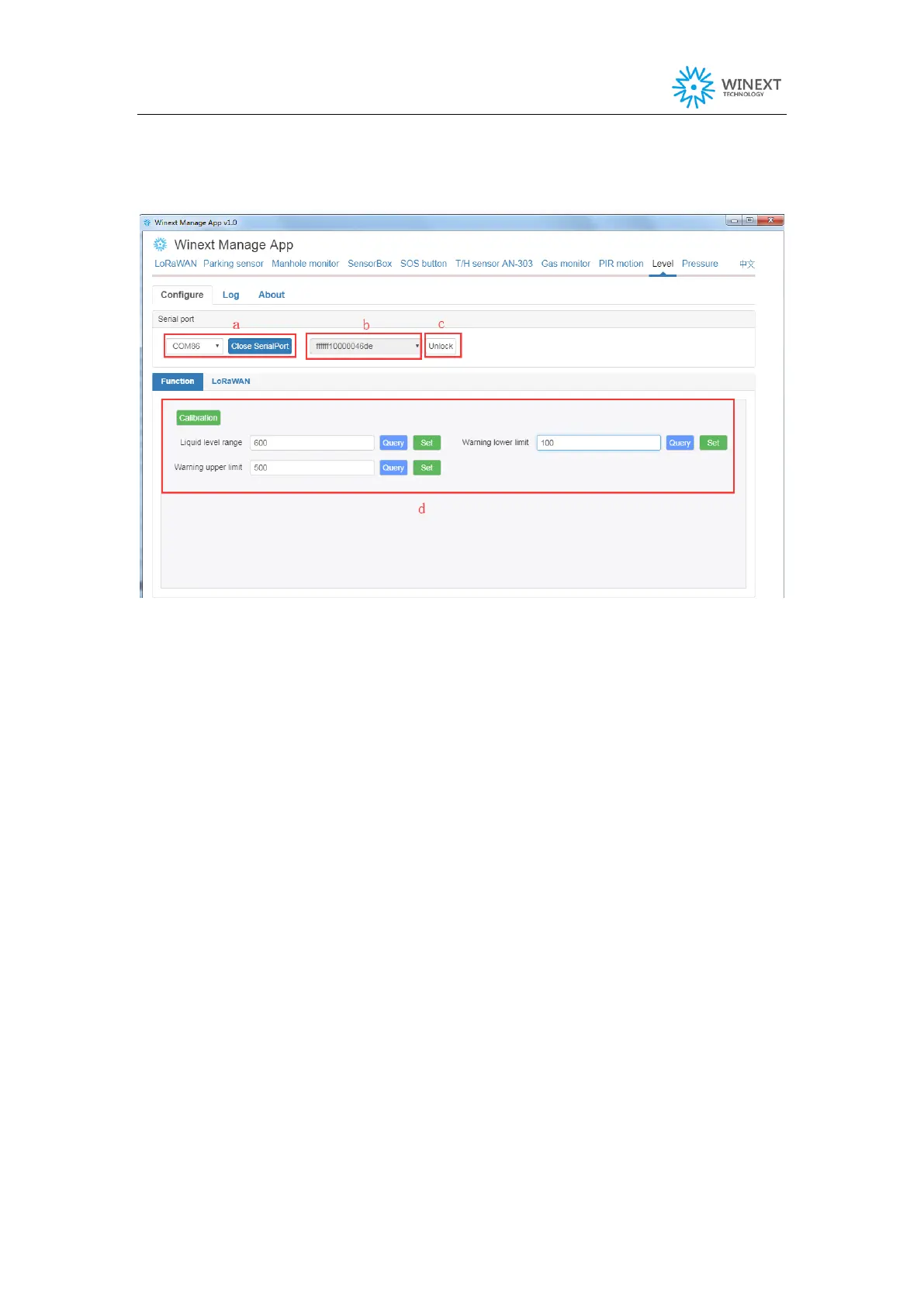 connected. The measurement unit is cm for water level range, upper alarm threshold