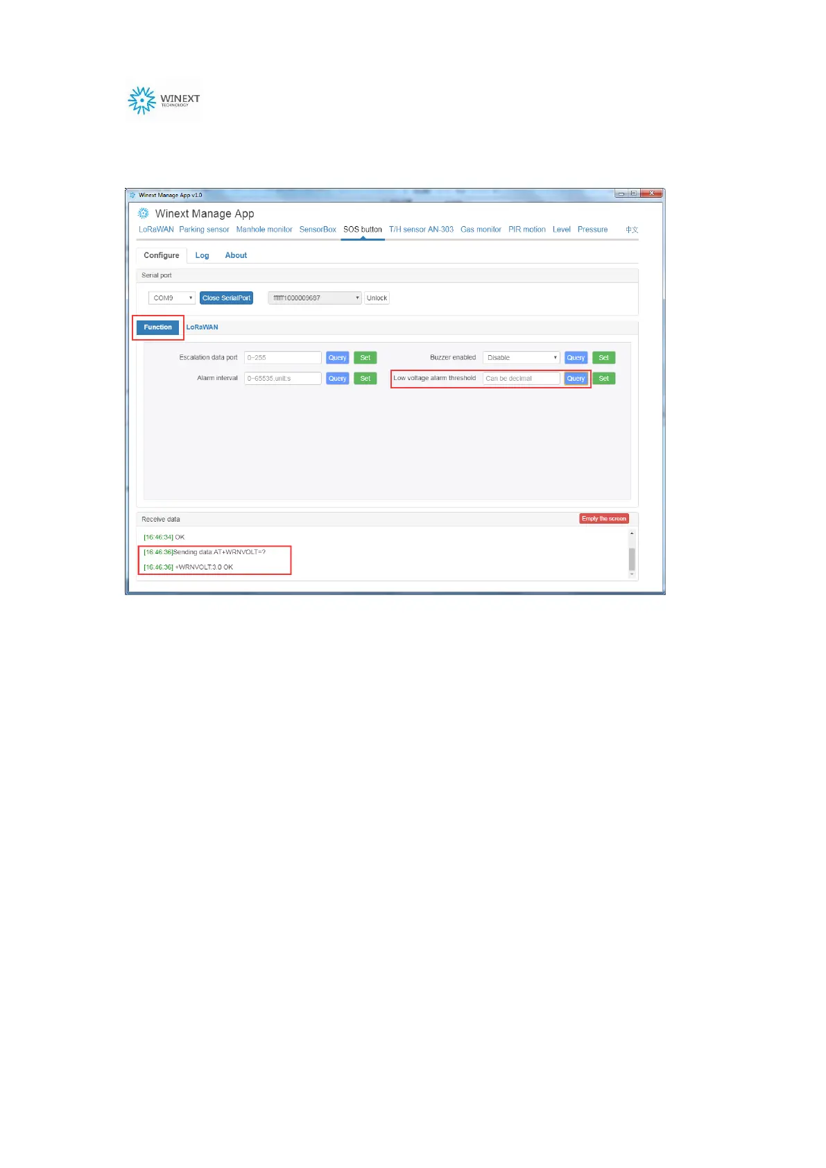 power threshold value, pls click “query”, it will show 3.0V in the Receive date window, as