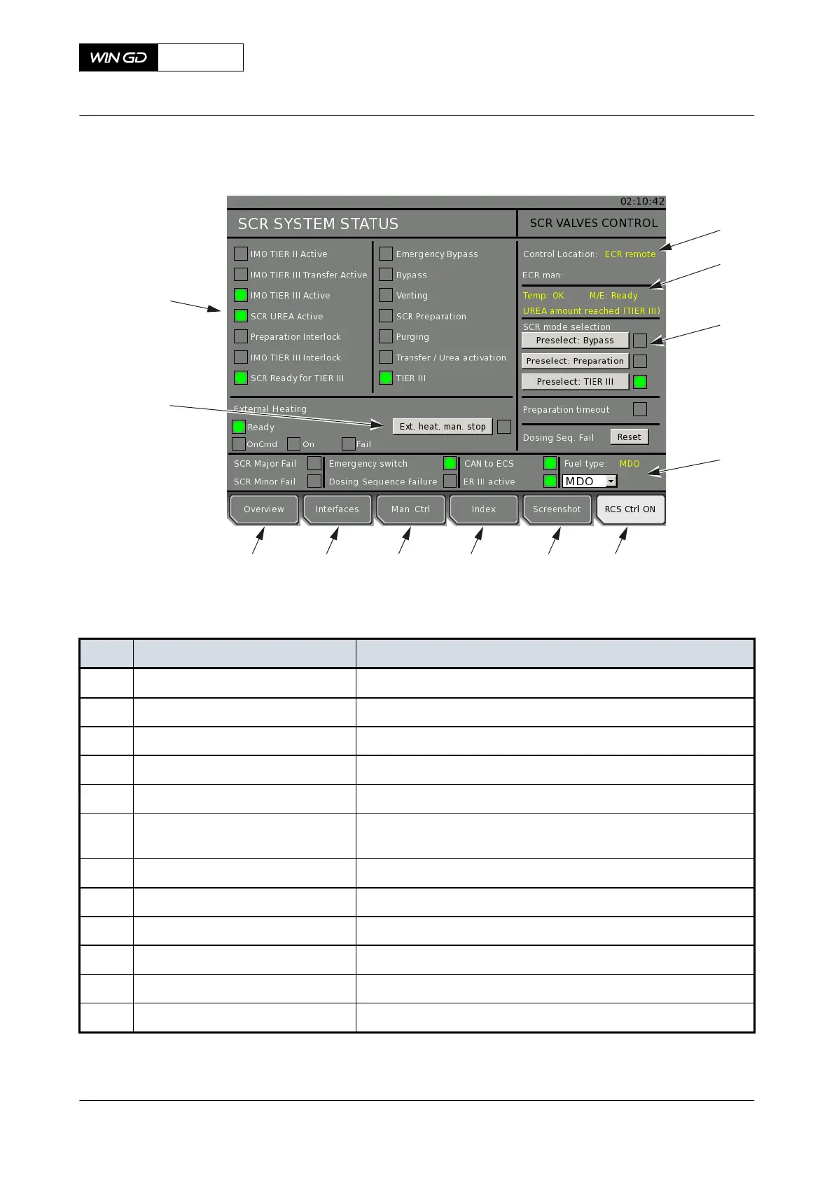 001 OVERVIEW button Opens the SCR system overview page