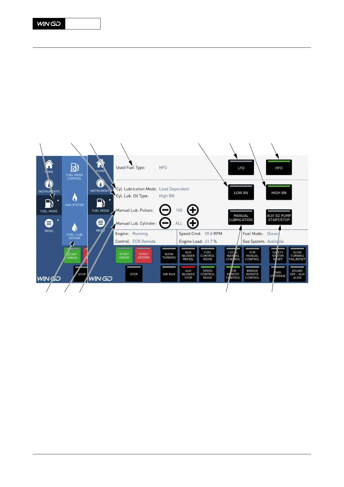 This page shows status of the fuel oil and cylinder lubrication oil system.