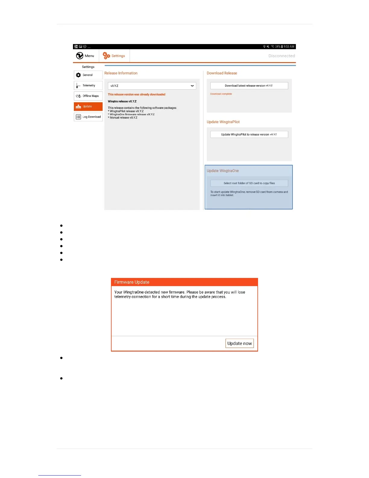 Clickon"Updatenow"tostartupdateprocess.WingtraPilotwilllosetelemetryconnectionfor