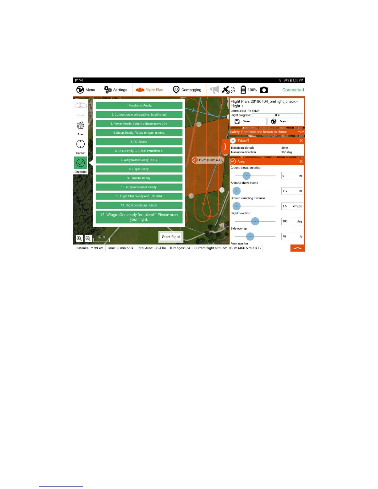 You are guided through the process of setting up your WingtraOne by the preflight checklist within WingtraPilot. The checklist slightly differs depending on the sensor and