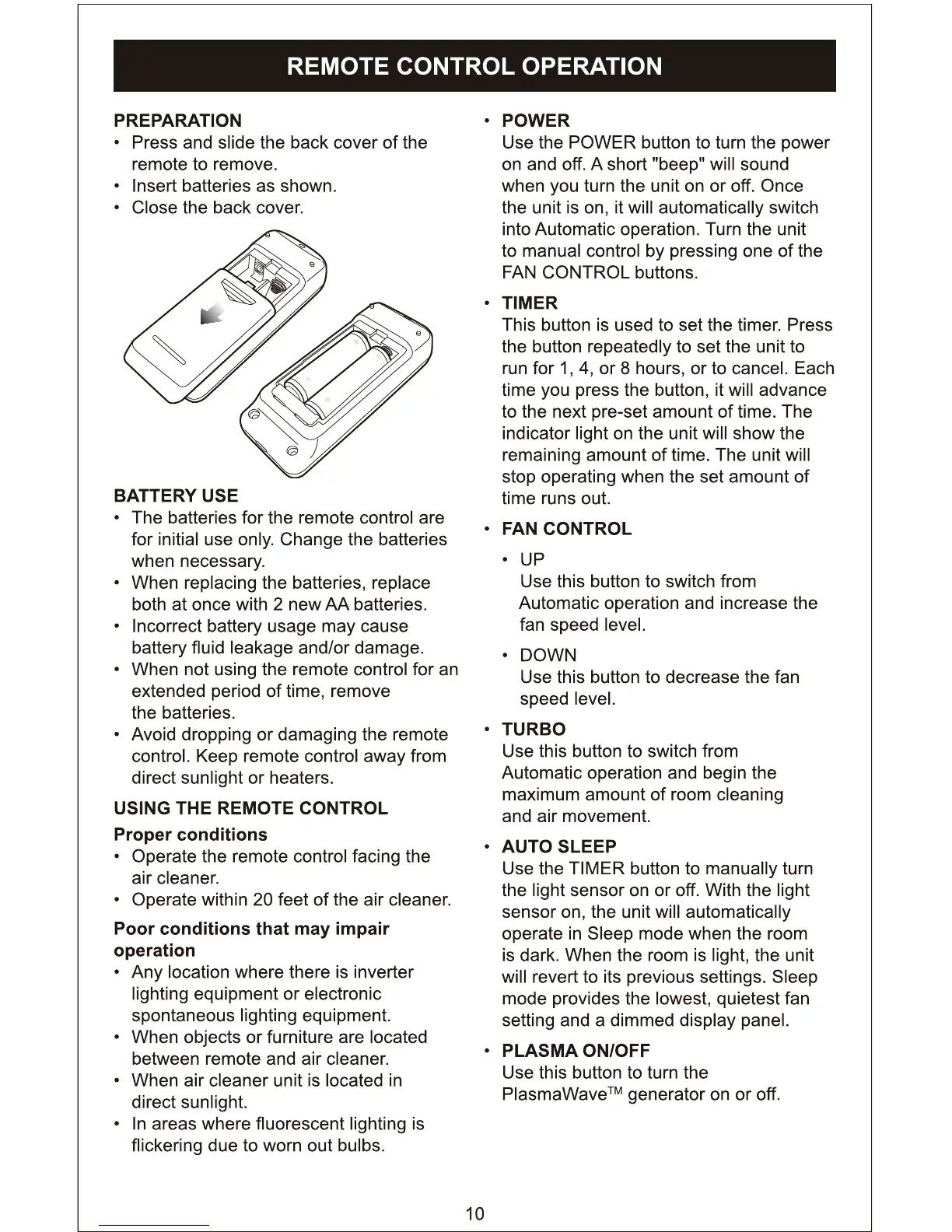 Winix 9500 - Remote Control Operation; Remote Power Button; Remote Timer Button; Remote Fan Control Buttons