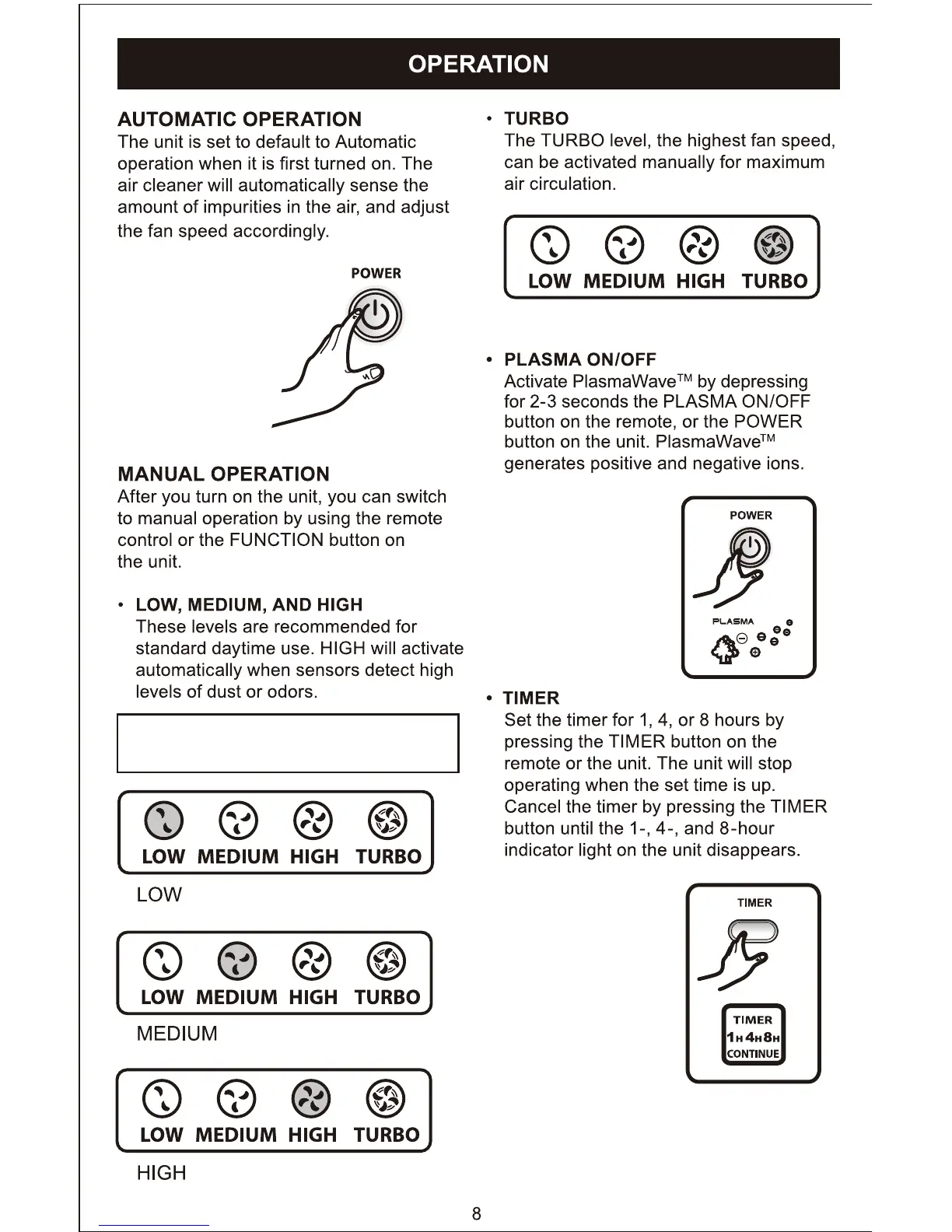 Winix 9500 - Operation Modes; Automatic Operation; Manual Operation Fan Speeds; Turbo Fan Speed