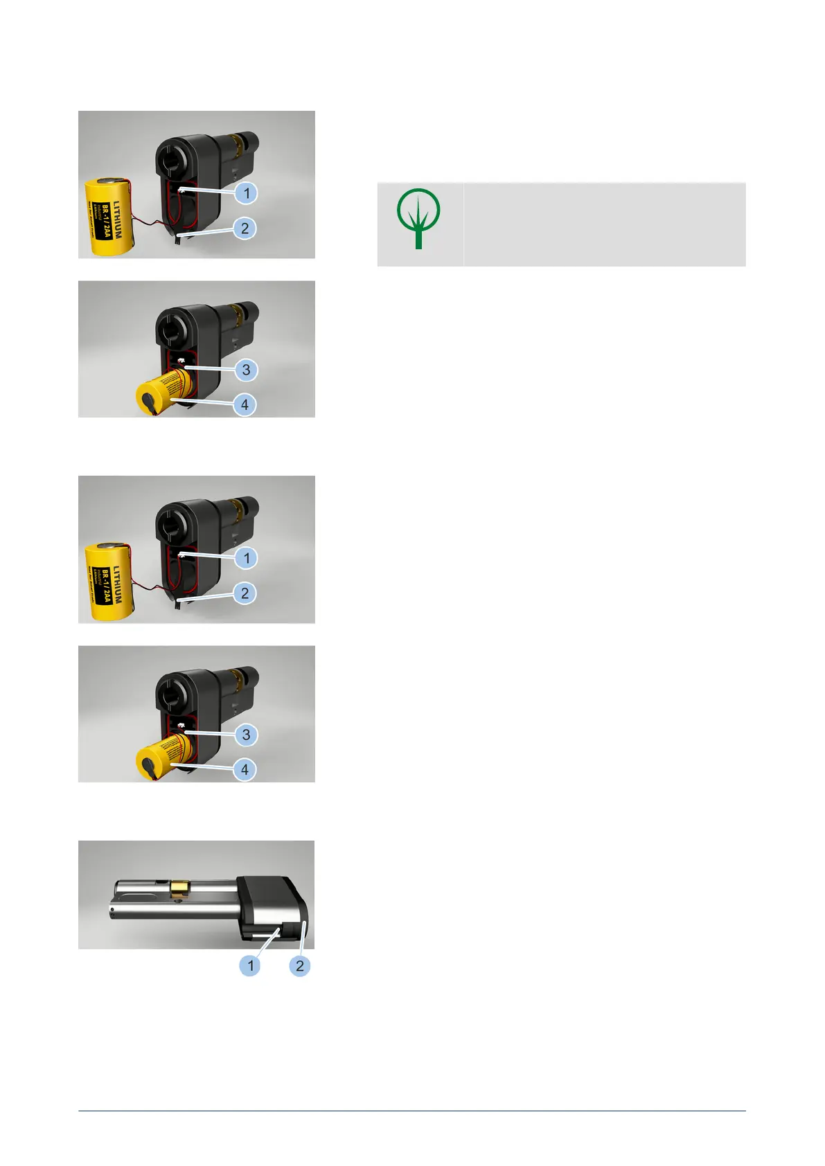 7. Insert new battery (4) from the battery set, including cable (3), into