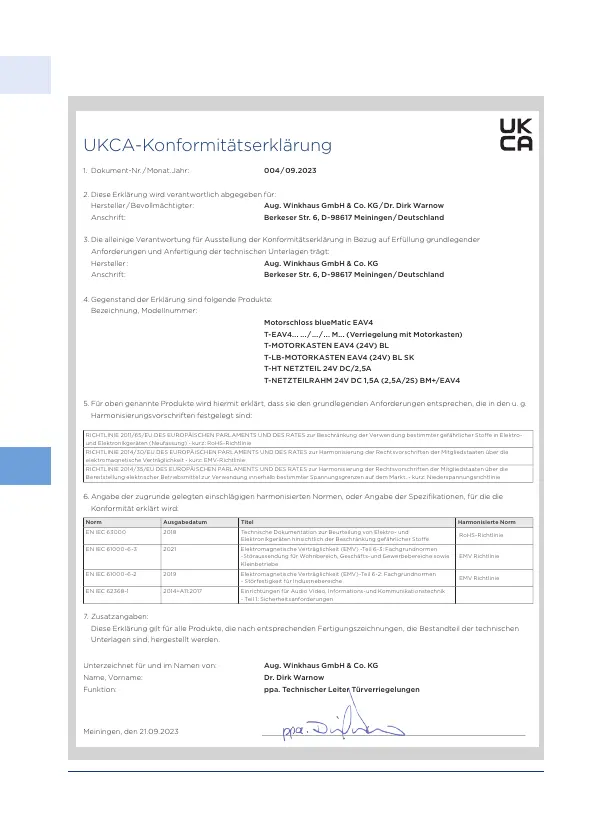 Hersteller / Bevollmächtigter: Aug. Winkhaus GmbH & Co. KG / Dr. Dirk Warnow