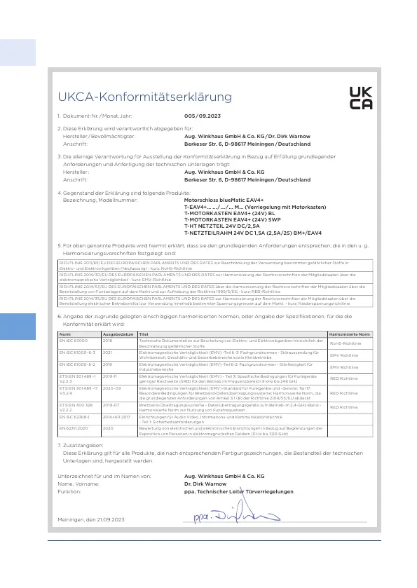 Hersteller / Bevollmächtigter: Aug. Winkhaus GmbH & Co. KG / Dr. Dirk Warnow