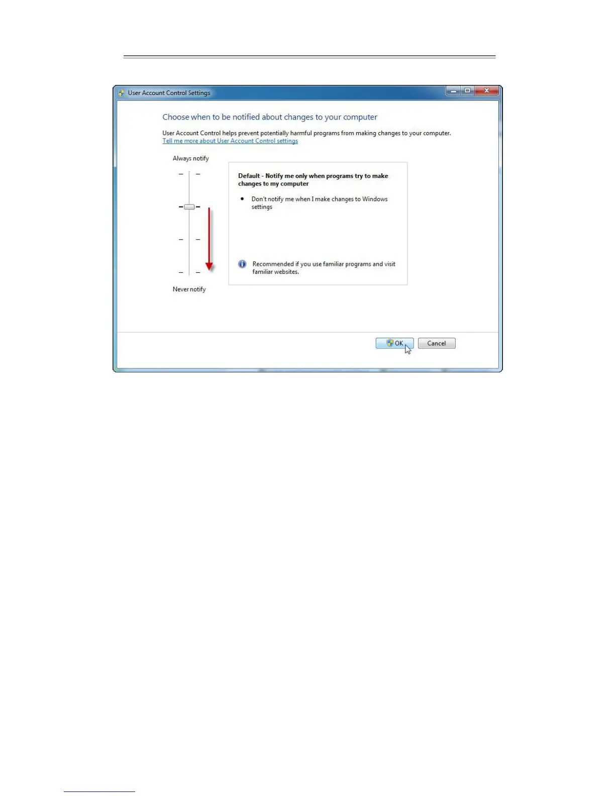 To turn UAC back on, move the slider to choose when you want to be notified, and