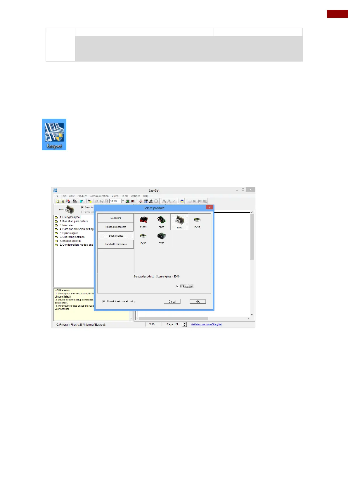 Select “Scan engines” and pick “ED40”. Make sure the “Online setup” option is checked, and