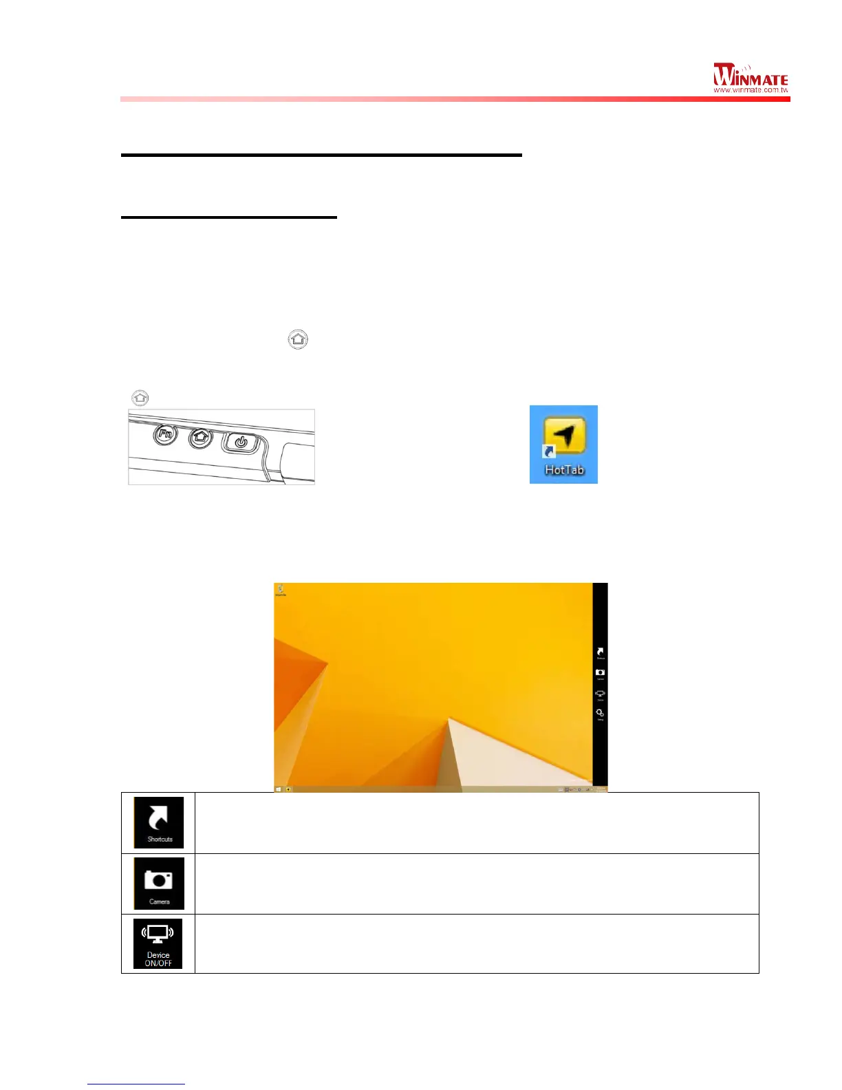 options: Shortcuts, Camera, Device ON/OFF, and Settings. Operations and functions on