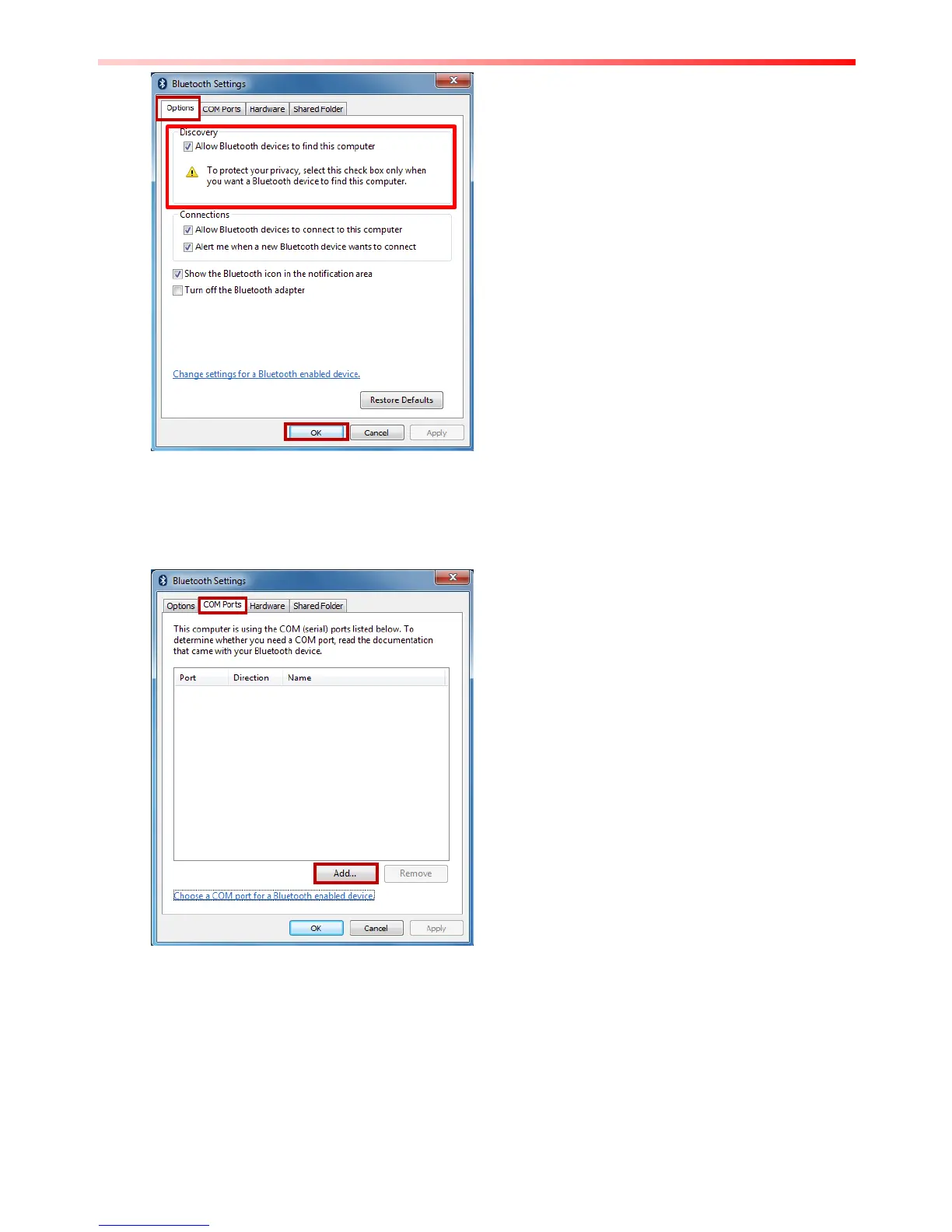 4. In the Bluetooth Settings menu, go to “COM Ports tab. COM port has to be setup for