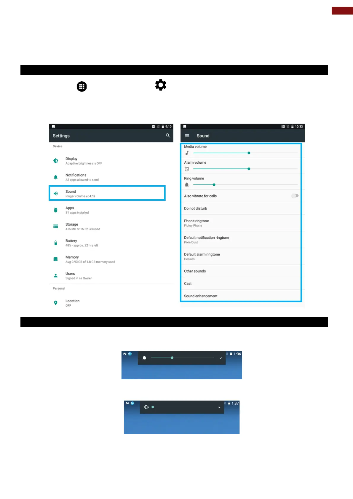 Use the sound settings to configure how and at what volume the tablet rings, vibrates or alerts user in other