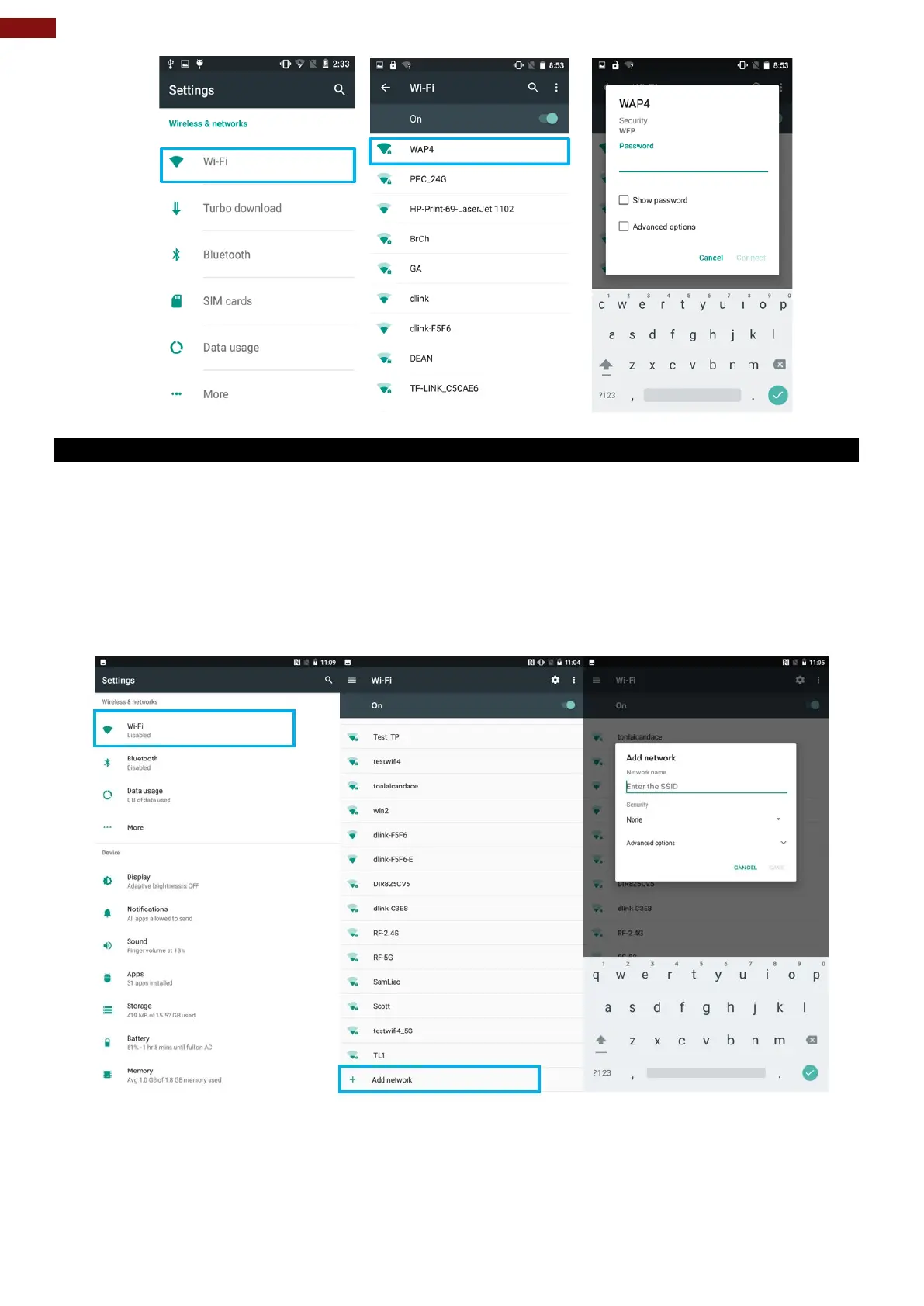 1. Turn on Wi-Fi, in the Wi-Fi settings screen, tap + Add network (at the bottom of the list of