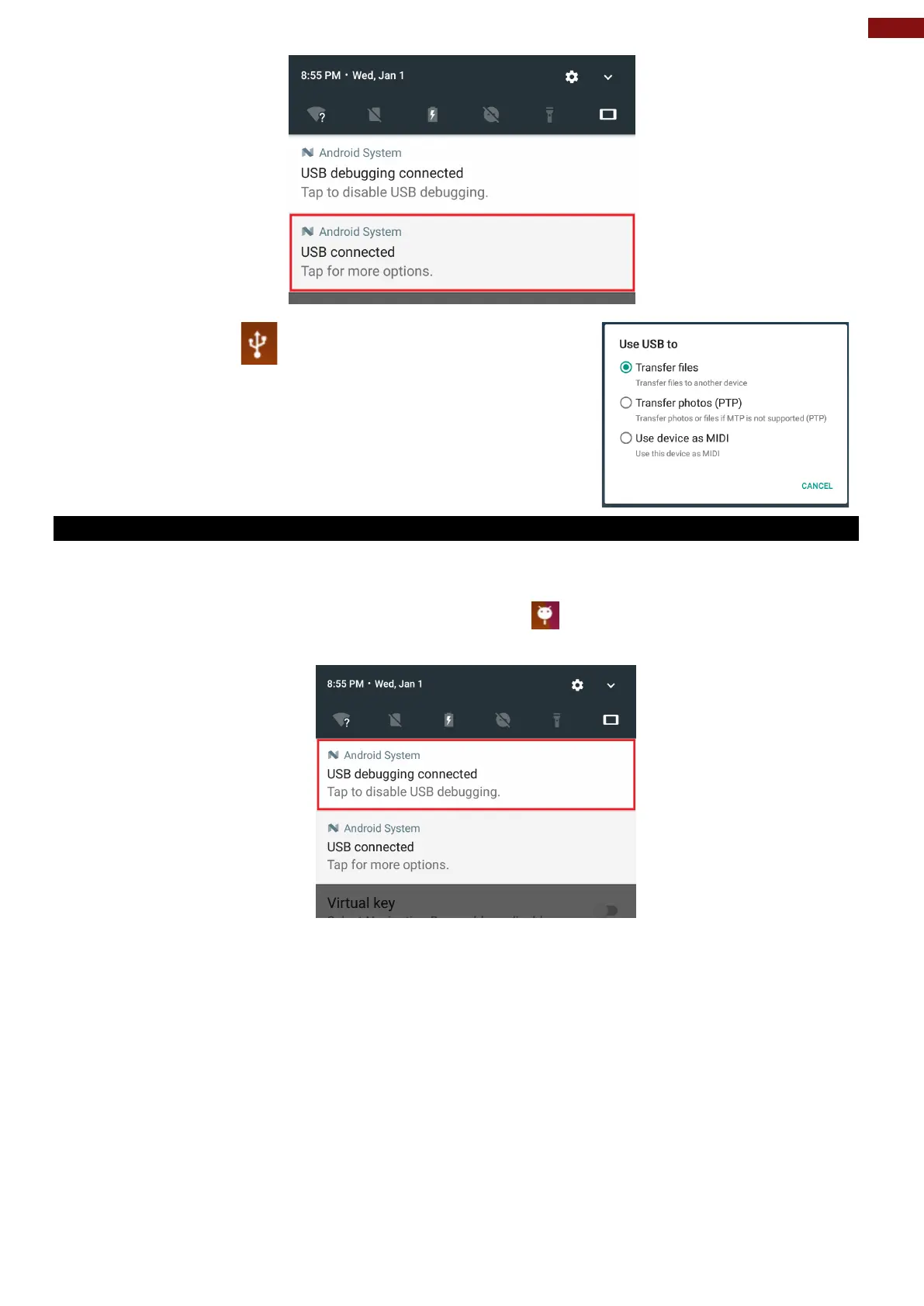 2. In the notifications area USB debugging connect sign