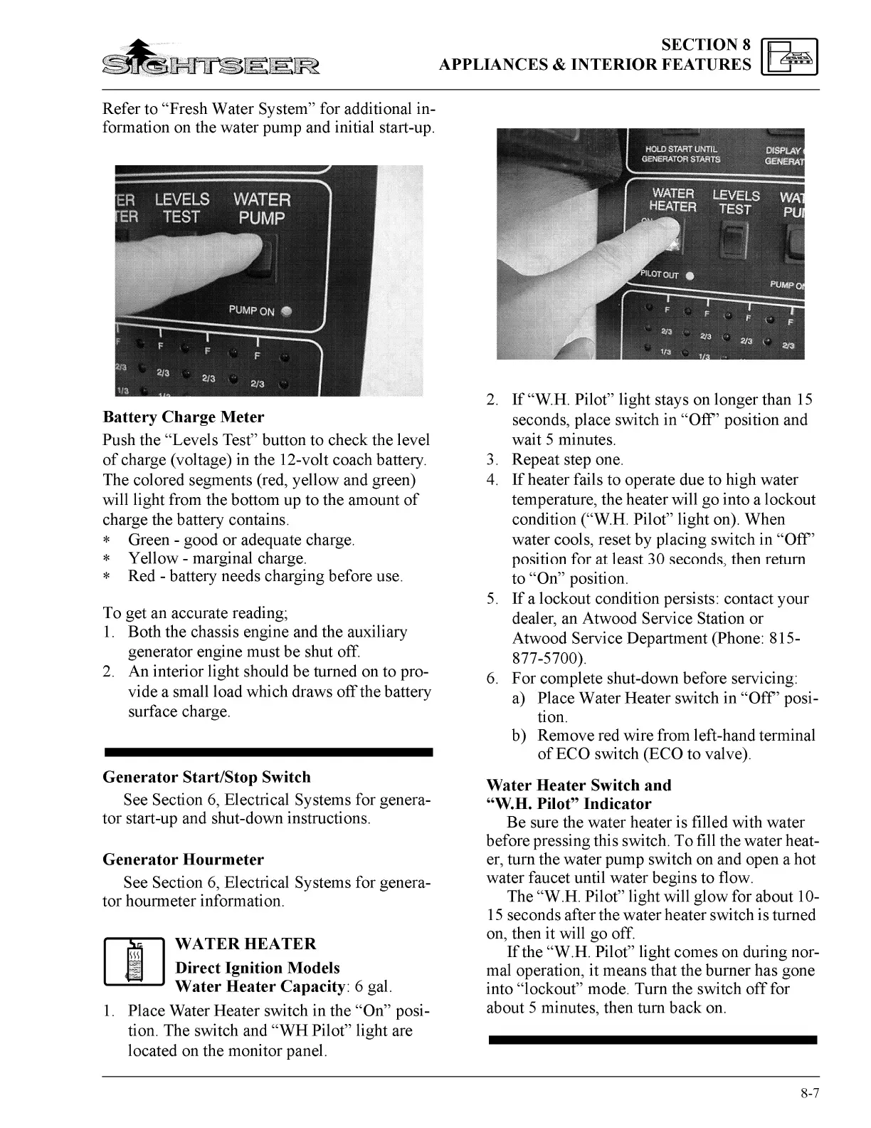 Winnebago 2002 Sightseer - Battery Charge Meter; Generator Start;Stop Switch; Generator Hourmeter; Water Heater Direct Ignition Models