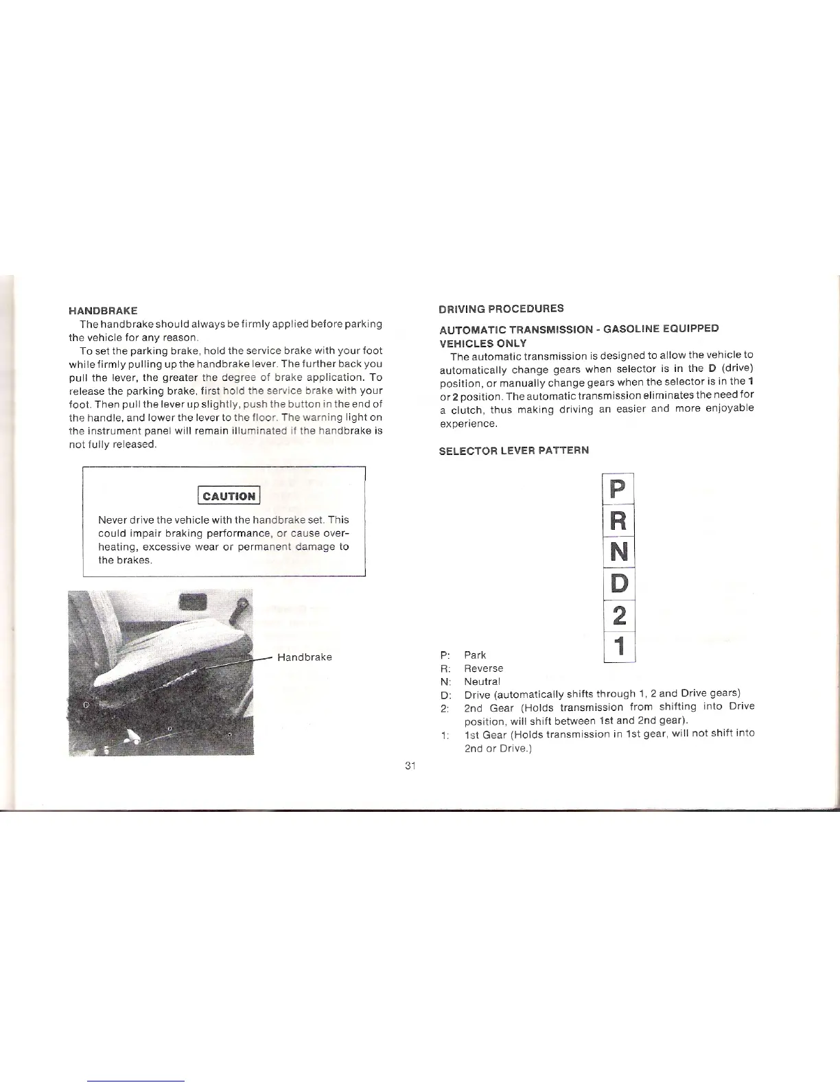 Winnebago Centauri - Handbrake; Driving Procedures; Automatic Transmission - Gasoline Equipped Vehicles; Selector Lever Pattern