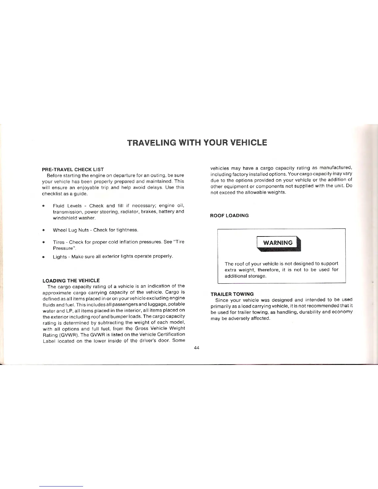 Winnebago Centauri - Traveling with Your Vehicle; Pre-Travel Check List; Loading the Vehicle; Roof Loading