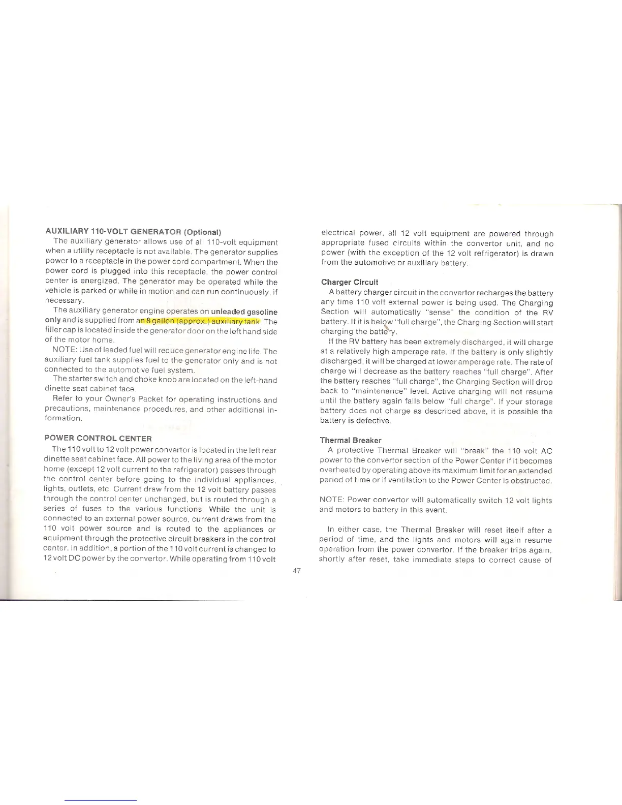 Winnebago Centauri - Auxiliary 110-Volt Generator; Power Control Center; Charger Circuit; Thermal Breaker