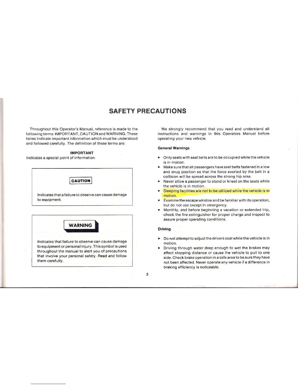 Winnebago Centauri - Safety Precautions; General Warnings; Driving