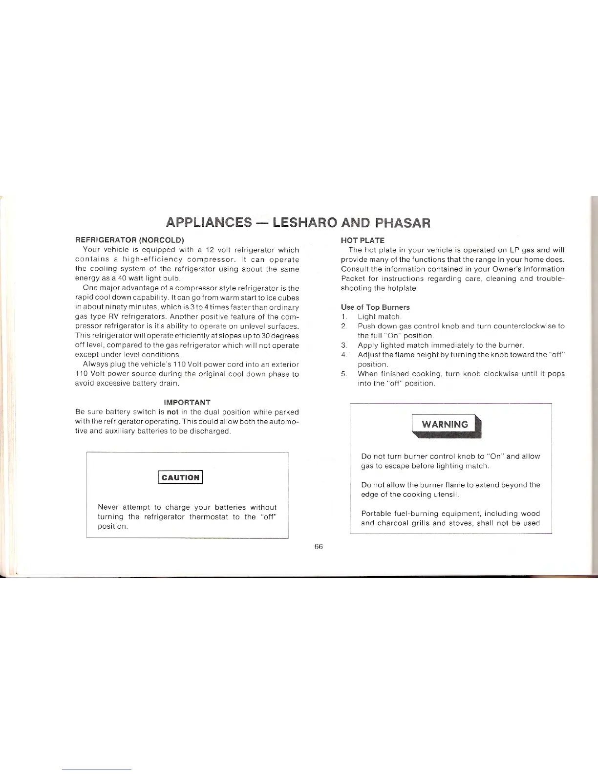 Winnebago Centauri - Appliancer - Lesharo and Phasar; Refrigerator; Hot Plate; Use of Top Burners