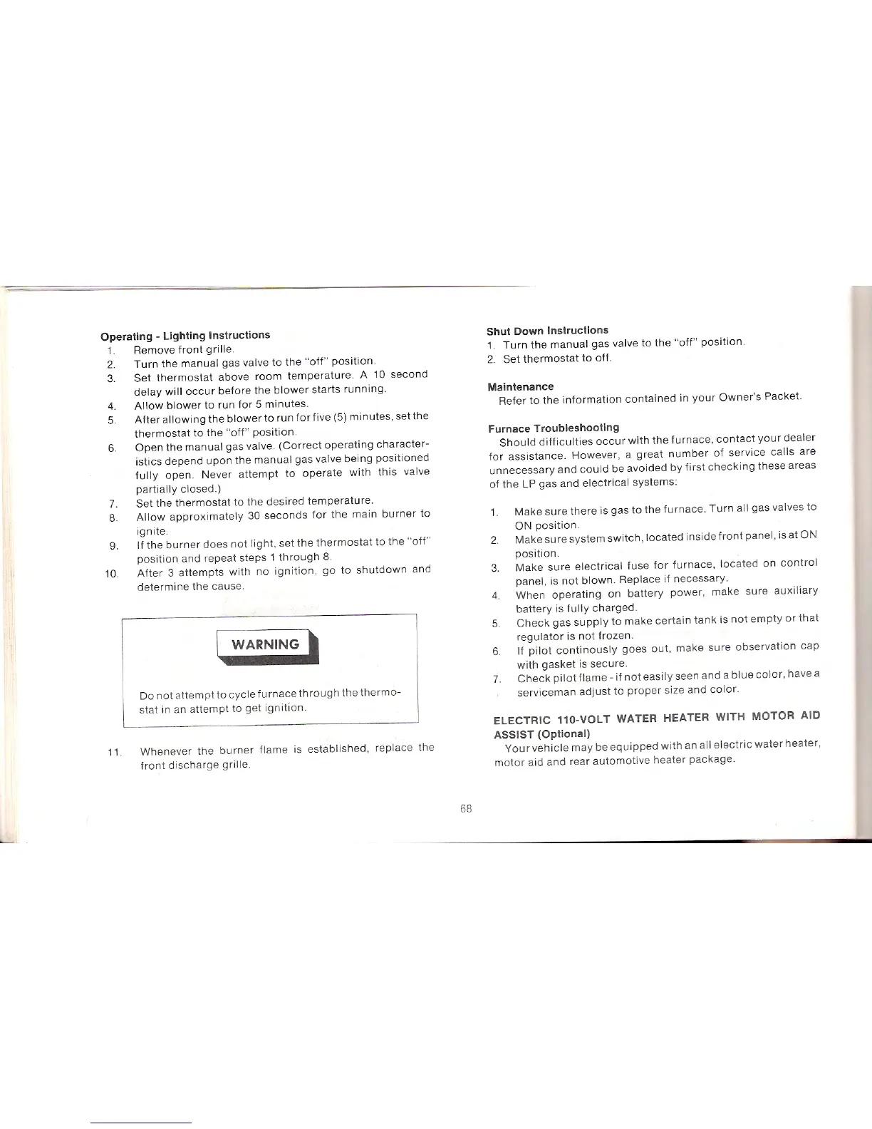 Winnebago Centauri - Electric 110 V Water Heater with Motor Aid Assist; Operating - Lighting Instructions; Shut down Instructions; Furnace Troubleshooting