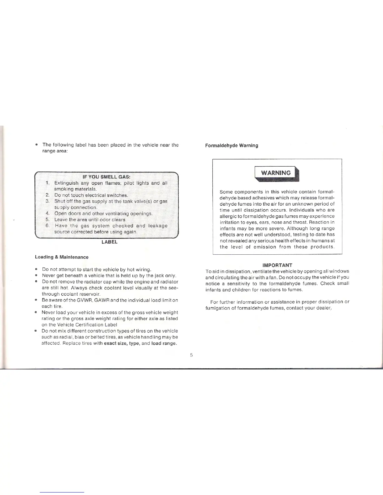 Winnebago Centauri - Loading and Maintenance; Formaldehyde Warning; If You Smell Gas