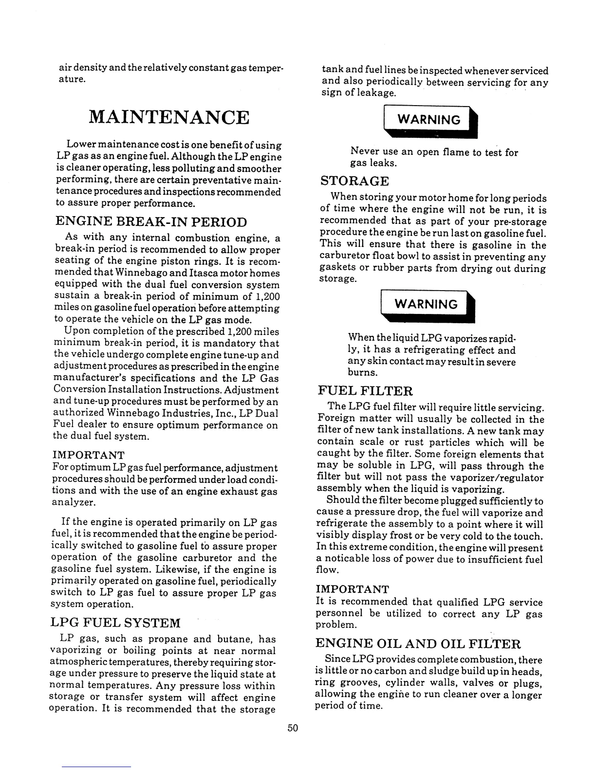 Winnebago Itasca - Maintenance; Engine Break-In Period; LPG Fuel System Maintenance; Fuel Filter Maintenance;Engine Oil and Oil Filter