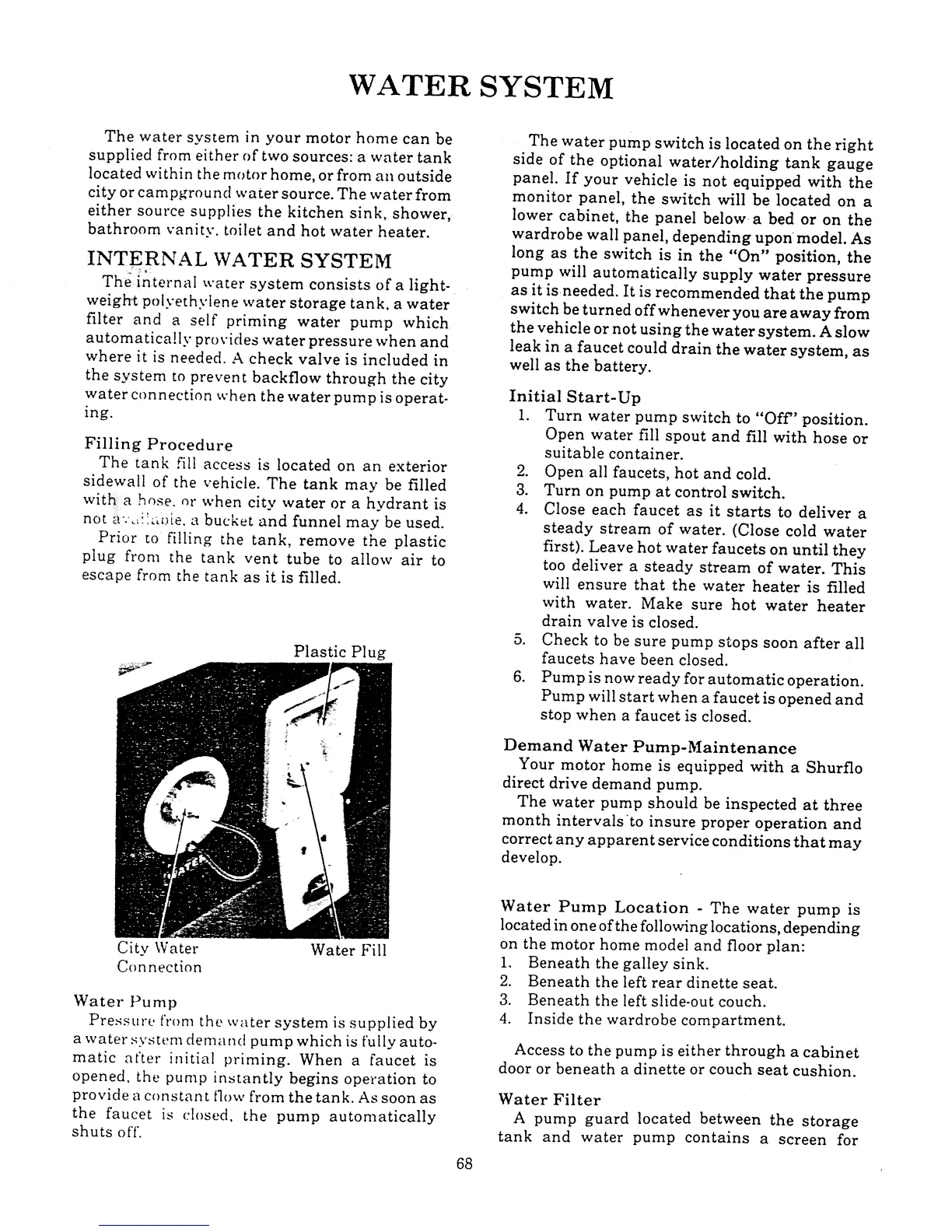Winnebago Itasca - Water System; Initial Start-Up; Demand Water Pump-Maintenance; Water Pump Location;Water Filter