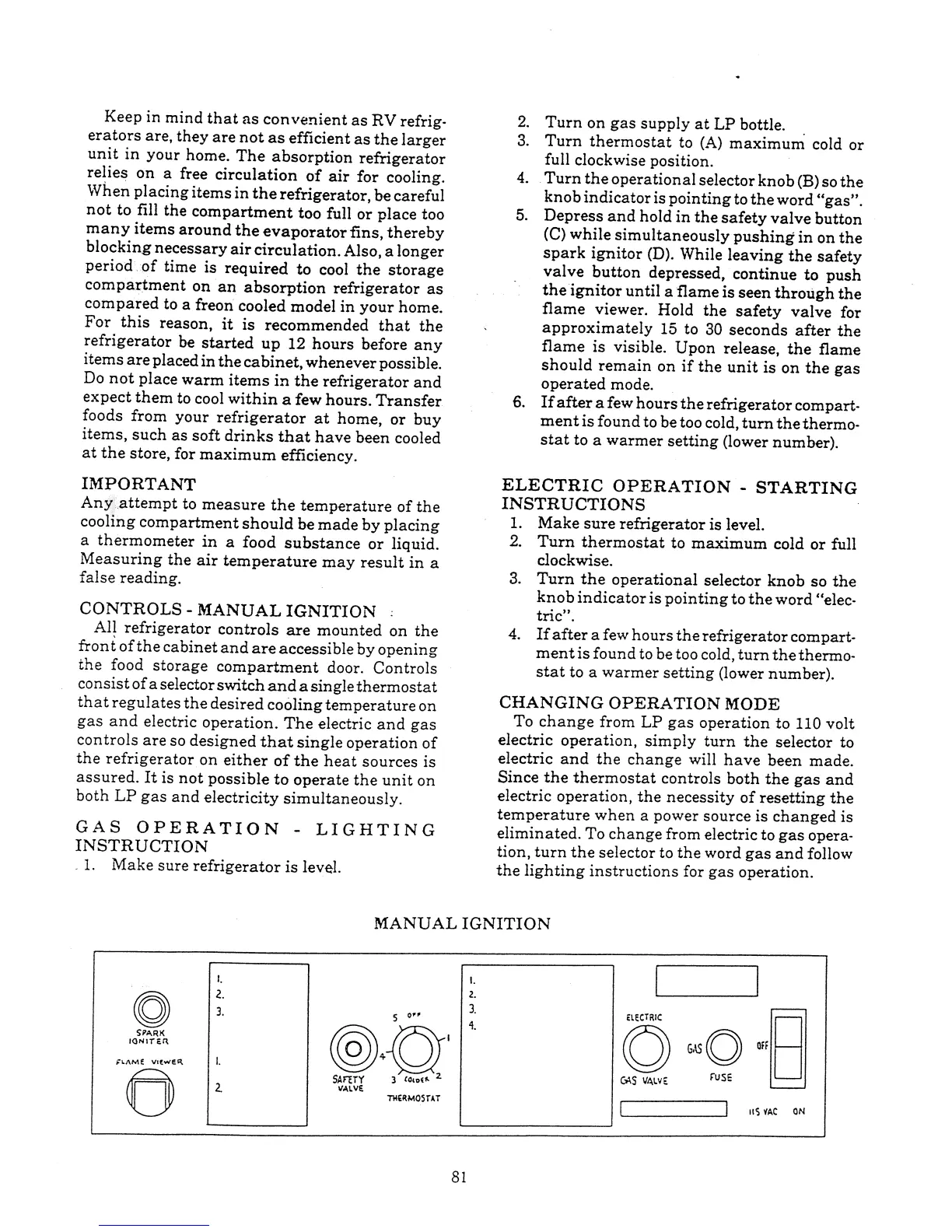 Winnebago Itasca - Controls - Manual Ignition (Refrigerator); Electric Operation - Starting Instructions (Refrigerator); Changing Operation Mode