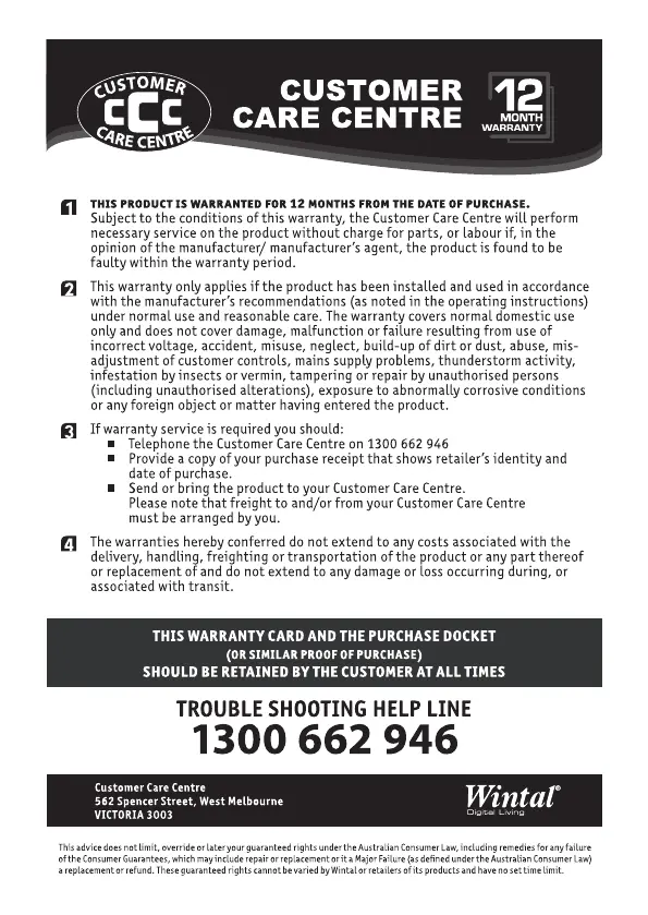 Wintal DAB20C - Customer Care and Warranty; Product Warranty Details; Warranty Service Procedure; Troubleshooting Help Line