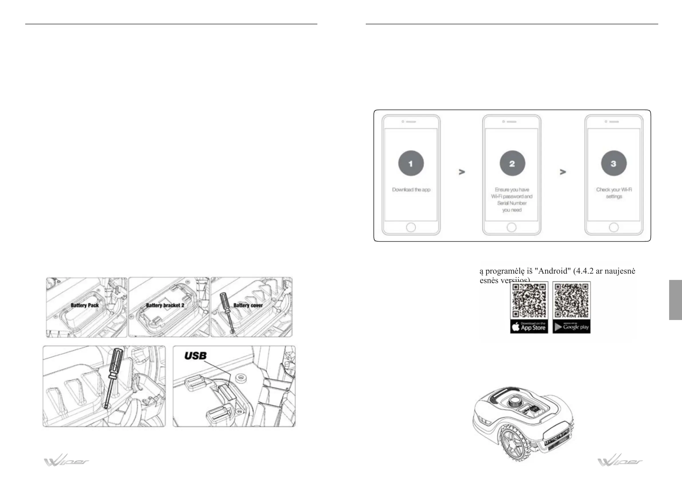 2. Visiškai įkraukite akumuliatorių ir išimkite jį iš vejapjovės.