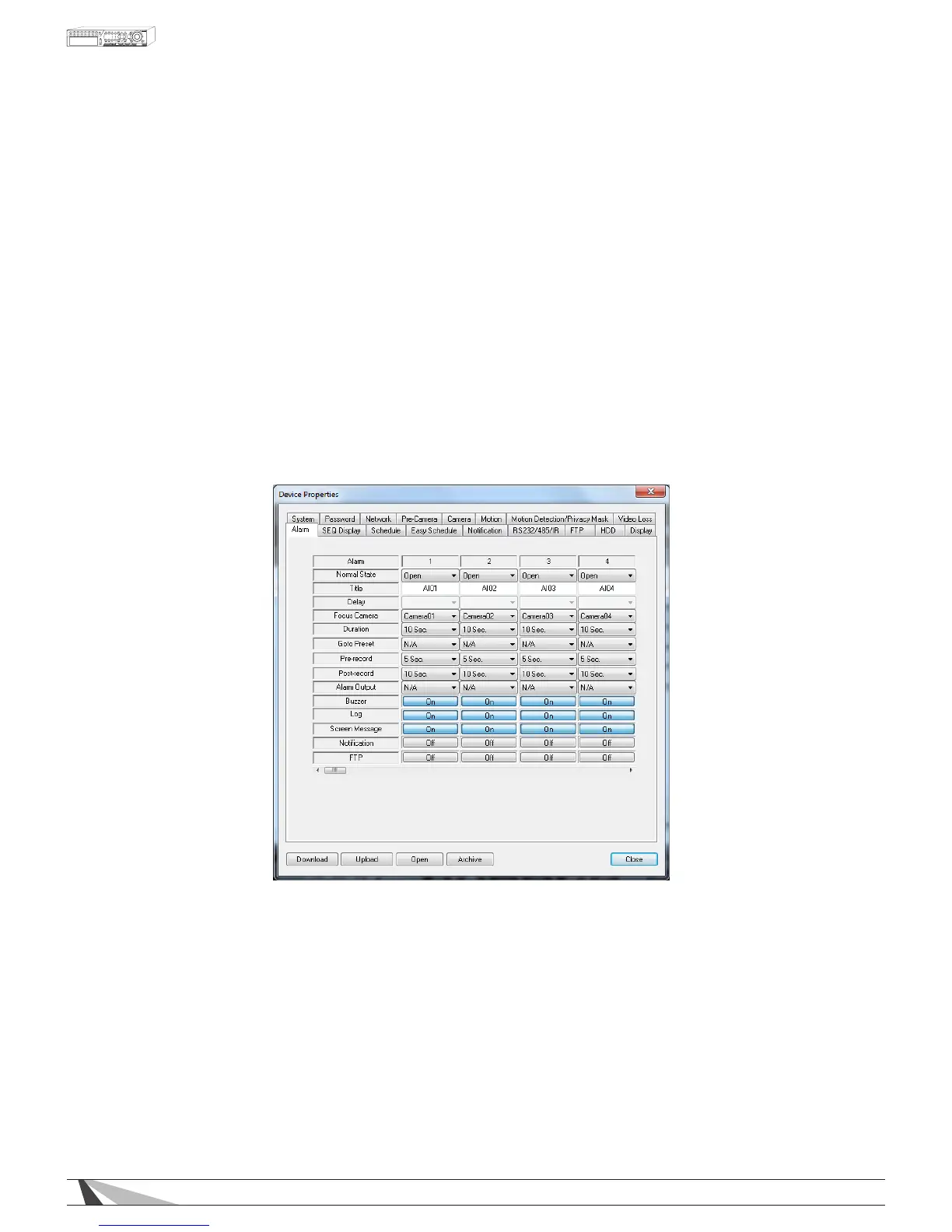 The Alarm Setup allows the administrator to dene the attributes for each alarm input and the actions if it