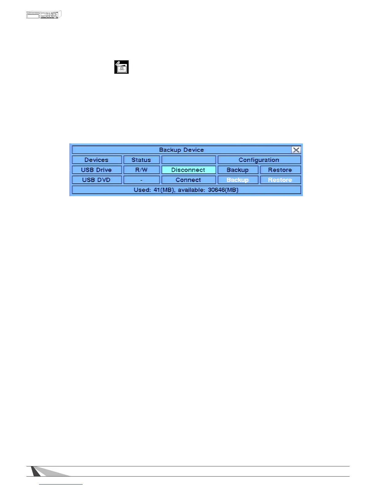 The Backup Device menu allows for backup and recovery of the DVR’s conguration to or from a USB device.