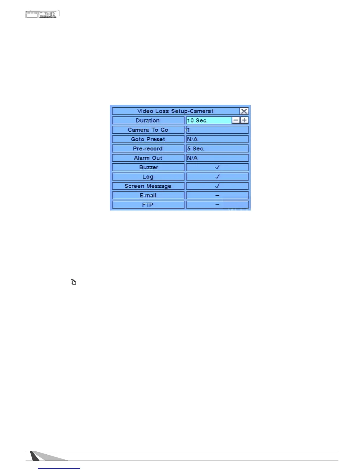 Press the COPY button on the front panel of the DVR or remote control to copy the Video Loss settings
