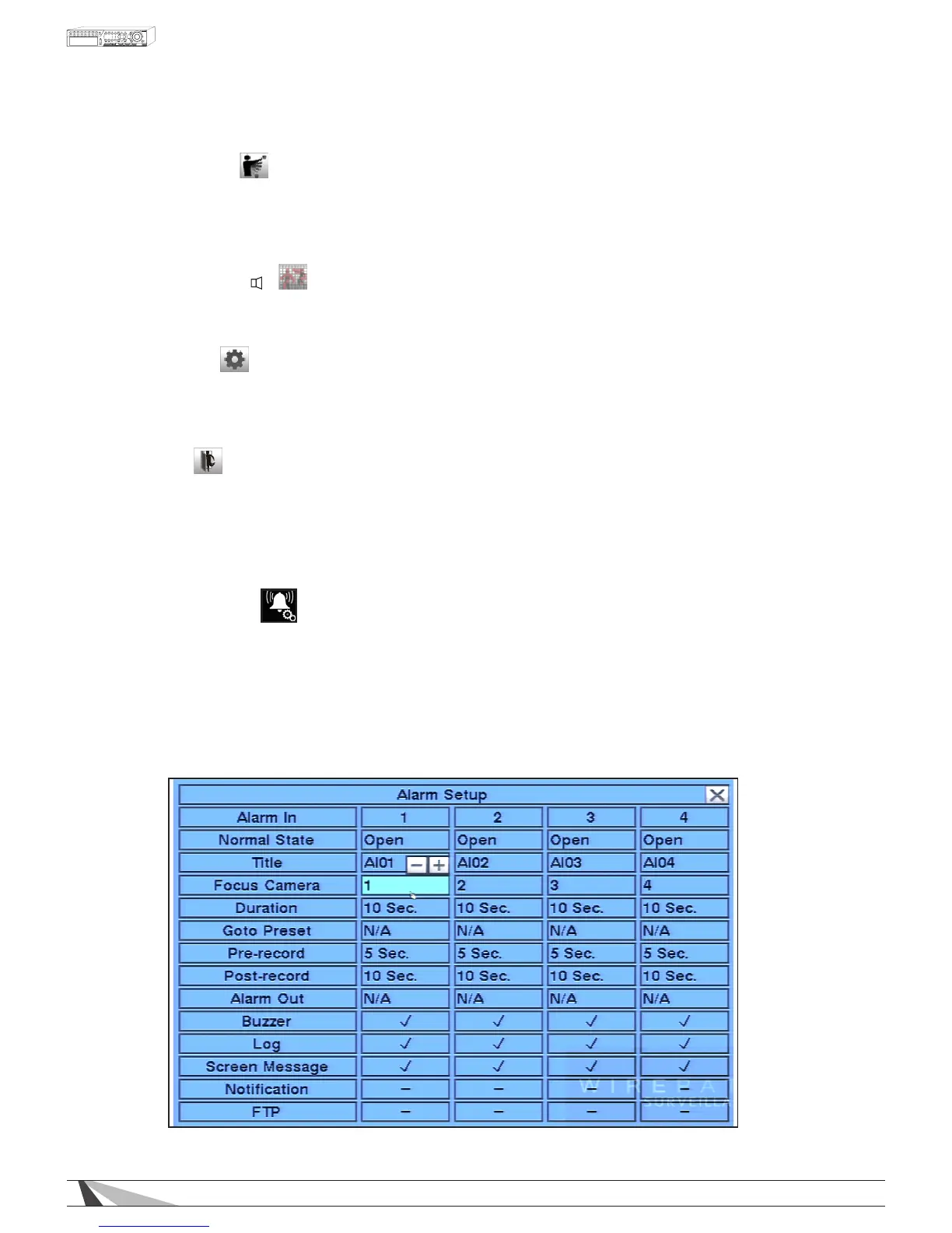 The Alarm Setup allows the administrator to dene the attributes for each alarm input and the actions if it is