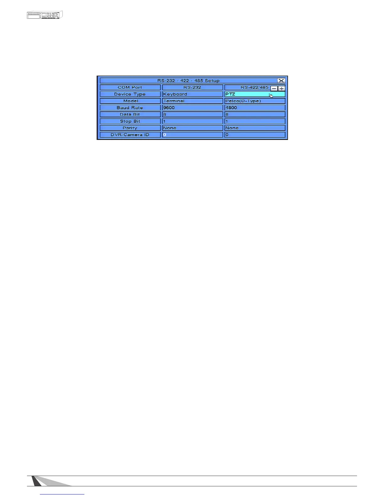 NOTE: For RS-422/485, only the Model, Baud Rate and DVR/Camera ID settings are congurable.