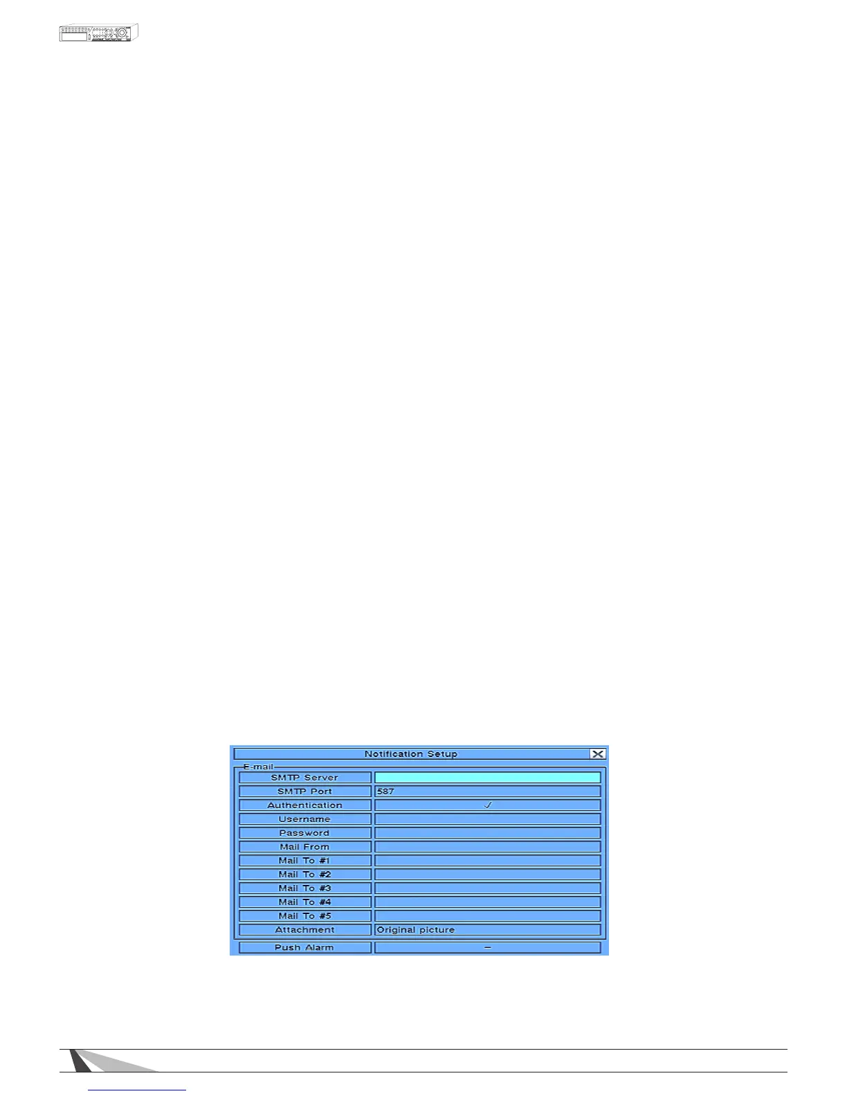 Press ENTER on the front panel of the DVR or on the remote to display the E-mail Setup menu. Alternatively